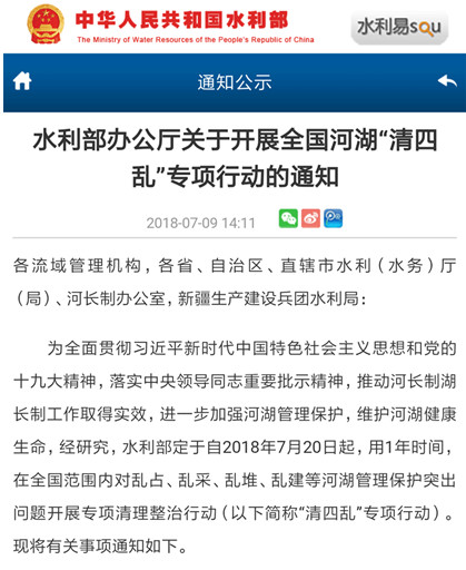7月9日水利部辦公廳發(fā)布《關(guān)于開展全國河湖“清四亂”專項行動的通知》。通知稱水利部定于自2018年7月20日起,用1年時間,在全國范圍內(nèi)對亂占、亂采、亂堆、亂建等河湖管理保護(hù)突出問題開展 “清四亂”專項行動。