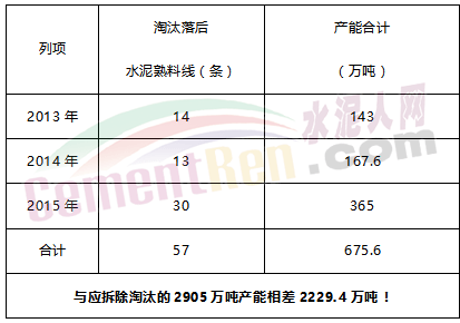 實際上,根據(jù)公告文件計算,2013年度云南省淘汰落后水泥熟料生產(chǎn)線14條產(chǎn)能143萬噸,2014年度淘汰落后水泥熟料生產(chǎn)線13條產(chǎn)能167.6萬噸,2015年度淘汰落后水泥熟料生產(chǎn)線30條產(chǎn)能365萬噸。即,2012年底至2015年底以來,云南省共拆除淘汰落后產(chǎn)能僅675.6萬噸,與應(yīng)拆除淘汰的2905萬噸產(chǎn)能相差2229.4萬噸!公告拆除產(chǎn)能與按等量置換應(yīng)拆除產(chǎn)能嚴(yán)重不符,如下表所示: