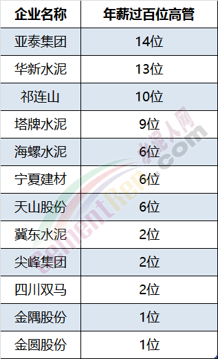 其中亞泰集團(tuán)有14位高管年薪過百萬,華新水泥有13位高管年薪過百萬。是百萬年薪最多的水泥企業(yè)。