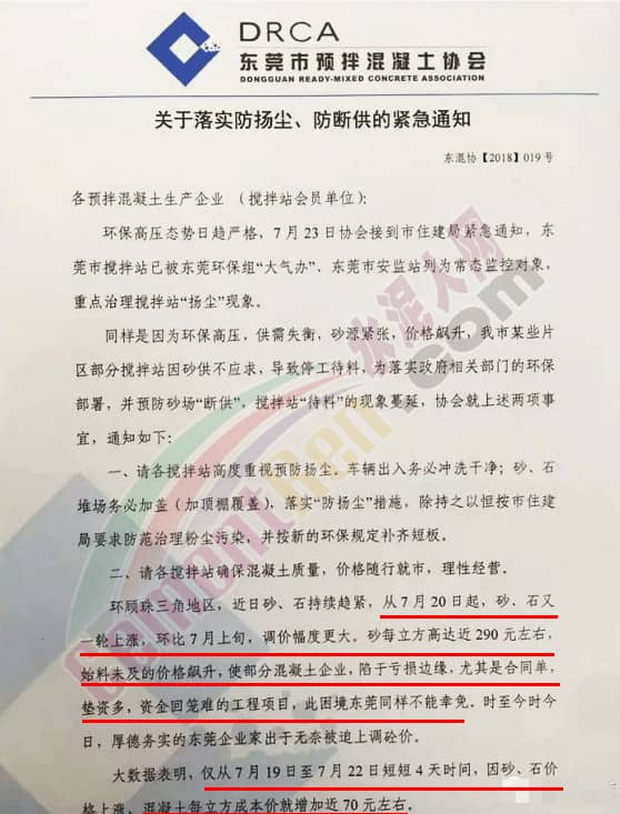 東莞市預(yù)拌混凝土協(xié)會發(fā)布關(guān)于落實(shí)防揚(yáng)塵、防斷供的緊急通知,通知稱環(huán)保高壓態(tài)勢日趨嚴(yán)格,7月23日協(xié)會接到市住建局緊急通知,東莞市攪拌站已被東莞環(huán)保組“大氣辦”、東莞市安監(jiān)站列為常態(tài)監(jiān)控對象,重點(diǎn)治理攪拌站“揚(yáng)塵”現(xiàn)象。