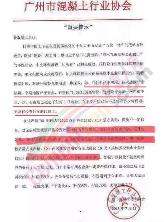 廣州市混凝土行業(yè)協(xié)會發(fā)布“重要警示”稱,隨著國家對砂、石場環(huán)保督查整治進(jìn)一步深入,砂、石骨料供不應(yīng)求,特別是砂嚴(yán)重缺貨,個別地區(qū)已經(jīng)無砂可賣,有余砂的也瘋狂調(diào)高售價,這對砼行業(yè)是一次嚴(yán)重沖擊,砂石市場已亮起了紅燈!目前砂、石主要矛盾已經(jīng)不是升多少價問題了,而是有沒有砂賣的問題了。
