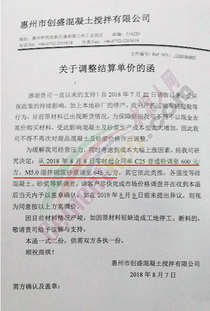 在砂石價(jià)格暴漲且嚴(yán)重缺貨,又趕上物流整治,嚴(yán)查大貨車超載運(yùn)輸?shù)榷嘀乇尘跋拢掠位炷疗髽I(yè)只能現(xiàn)金交易,一天一價(jià)?;葜菔袆?chuàng)盛混凝土攪拌有限公司發(fā)布調(diào)整結(jié)算單價(jià)的函稱,為緩解公司經(jīng)營(yíng)壓力,同時(shí)考慮成本大幅上漲因素,決定上調(diào)產(chǎn)品價(jià)格,C25普通砼調(diào)至600元/方,M5.0砂漿調(diào)至645元/方。