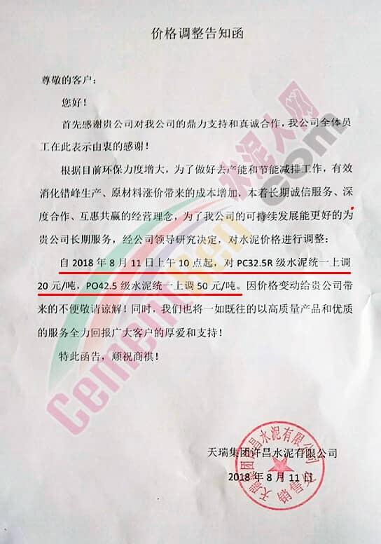 天瑞集團許昌水泥有限公司價格調(diào)整告知函稱,根據(jù)目前環(huán)保力度增大,為了做好去產(chǎn)能和節(jié)能減排工作,有效消化錯峰生產(chǎn)、原材料漲價帶來的成本增加,本著長期誠信服務(wù)、深度合作、互惠共贏的經(jīng)營理念,為了公司的可持續(xù)發(fā)展,自2018年8月11日上午10點起對PC32.5R級水泥統(tǒng)一上調(diào)20元/噸,PO42.5級水泥統(tǒng)一上調(diào)50元/噸。
