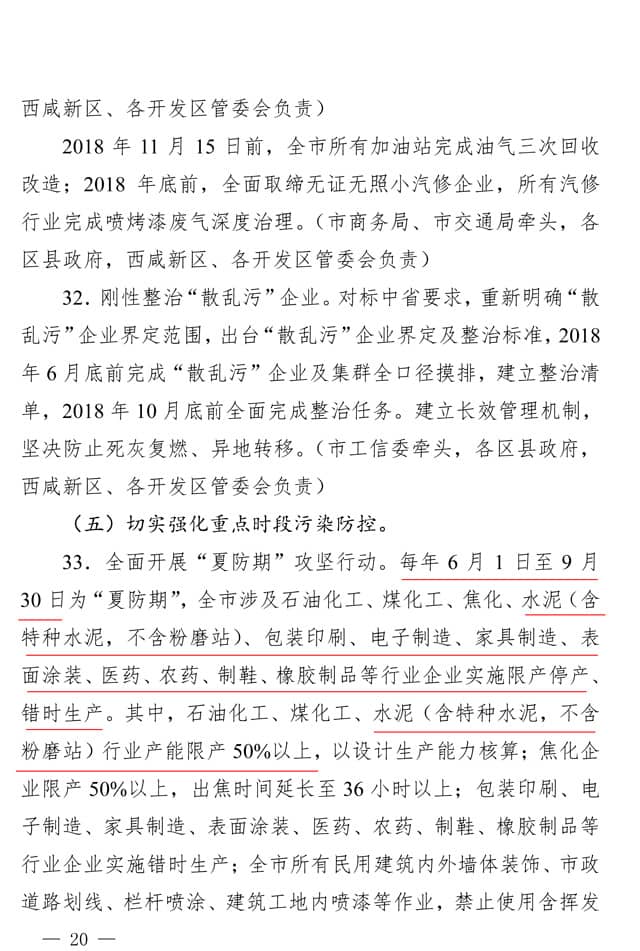 根據(jù)文件,西安市全面開展“夏防期”攻堅(jiān)行動(dòng)。每年 6 月 1 日至 9 月 30 日為“夏防期” ,全市涉及石油化工、煤化工、焦化、水泥(含特種水泥,不含粉磨站)、包裝印刷、電子制造、家具制造、表面涂裝、醫(yī)藥、農(nóng)藥、制鞋、橡膠制品等行業(yè)企業(yè)實(shí)施限產(chǎn)停產(chǎn)、錯(cuò)時(shí)生產(chǎn)。其中,石油化工、煤化工、水泥(含特種水泥,不含 粉磨站)行業(yè)產(chǎn)能限產(chǎn) 50%以上,以設(shè)計(jì)生產(chǎn)能力核算;焦化企 業(yè)限產(chǎn) 50%以上,出焦時(shí)間延長(zhǎng)至 36 小時(shí)以上;包裝印刷、電子制造、家具制造、表面涂裝、醫(yī)藥、農(nóng)藥、制鞋、橡膠制品等行業(yè)企業(yè)實(shí)施錯(cuò)時(shí)生產(chǎn);全市所有民用建筑內(nèi)外墻體裝飾、市政道路劃線、欄桿噴涂、建筑工地內(nèi)噴漆等作業(yè),禁止使用含揮發(fā)性有機(jī)溶劑的涂料;機(jī)動(dòng)車參照“冬防期”限行辦法實(shí)施限行管控,必要時(shí)實(shí)施機(jī)動(dòng)車單雙號(hào)限行措施。
