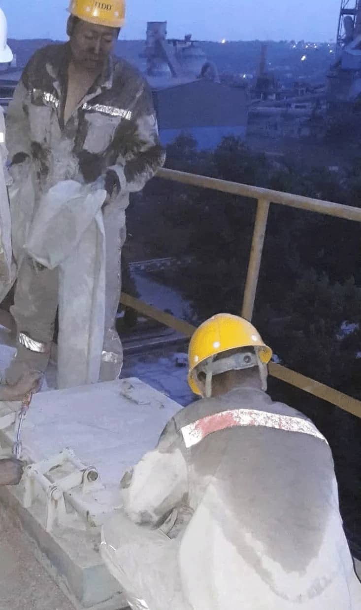 13:30開始,副經(jīng)理張全然、生產(chǎn)運(yùn)行二部部長張艷培及生料工序長龐迎春親自帶領(lǐng)生料工序員工將檢測收塵器濾袋使用的熒光粉及新濾袋,從地面背到40米高的收塵器上。工藝室李慧芳、王璐配合收塵袋廠家現(xiàn)場檢查。調(diào)度長朱紅軍在現(xiàn)場協(xié)調(diào)后勤保障工作。