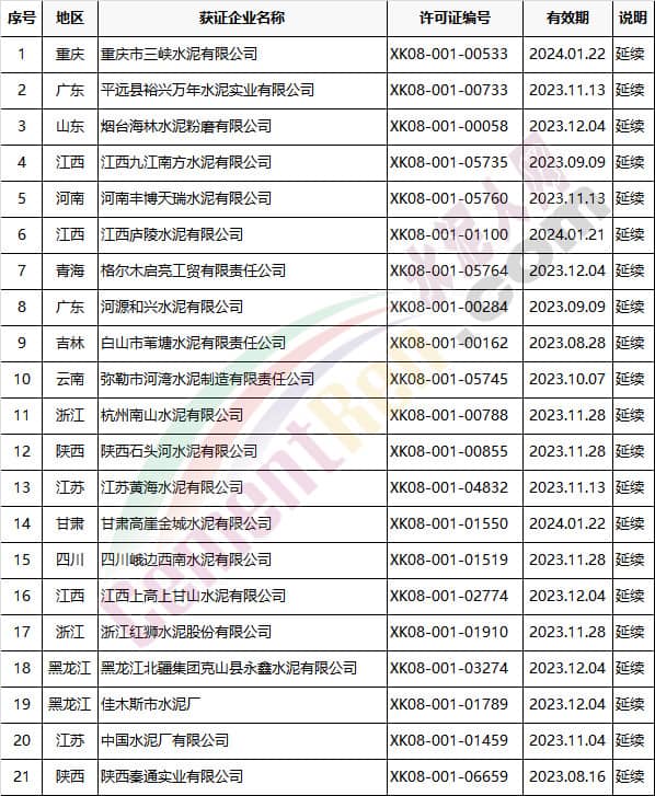 【水泥人網(wǎng)】日前,國家質檢總局全國工業(yè)產品生產許可證辦公室發(fā)放8月份第二批水泥企業(yè)生產許可證。共33個證書編號,其中新發(fā)證書一家企業(yè),為寧夏金昱元廣拓能源有限公司;到期延續(xù)21家企業(yè);涉及名稱變更、許可范圍變更和取證方式變更共11家企業(yè)。詳情如下: