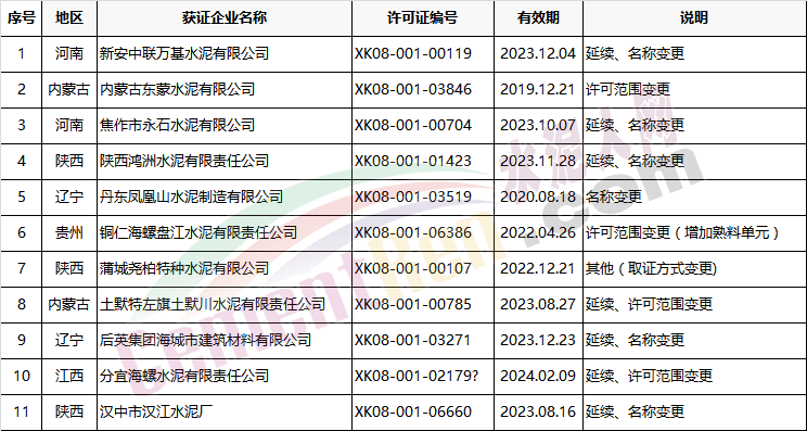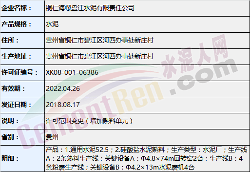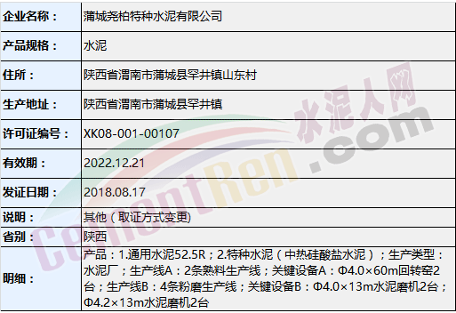 以上涉及變更的企業(yè)中,貴州銅仁海螺盤江水泥有限責任公司許可范圍變更內容為增加熟料單元;陜西蒲城堯柏特種水泥有限公司為取證方式變更。變更后生產許可證詳情如下: