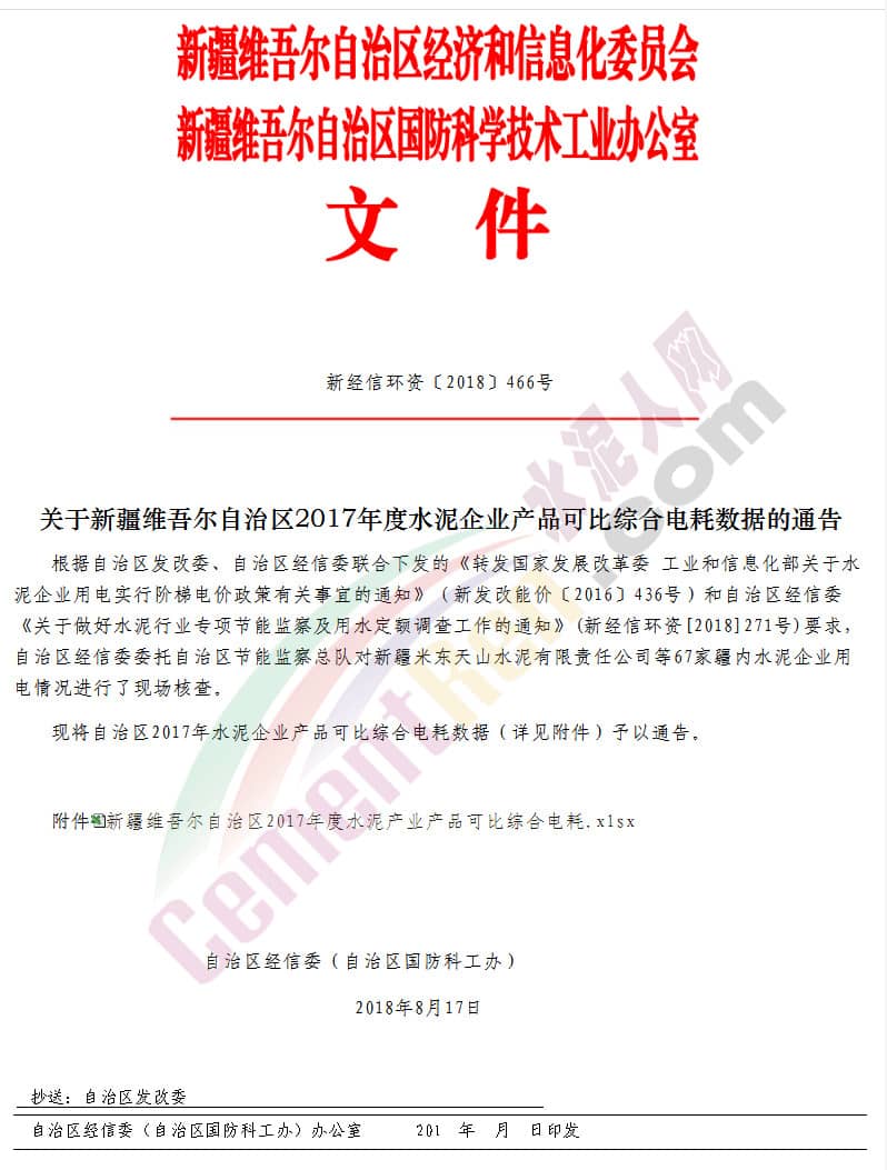 【水泥人網(wǎng)】新疆維吾爾自治區(qū)經(jīng)濟(jì)和信息化委員會(huì)發(fā)布《關(guān)于新疆維吾爾自治區(qū)2017年度水泥企業(yè)產(chǎn)品可比綜合電耗數(shù)據(jù)的通告》通告稱: