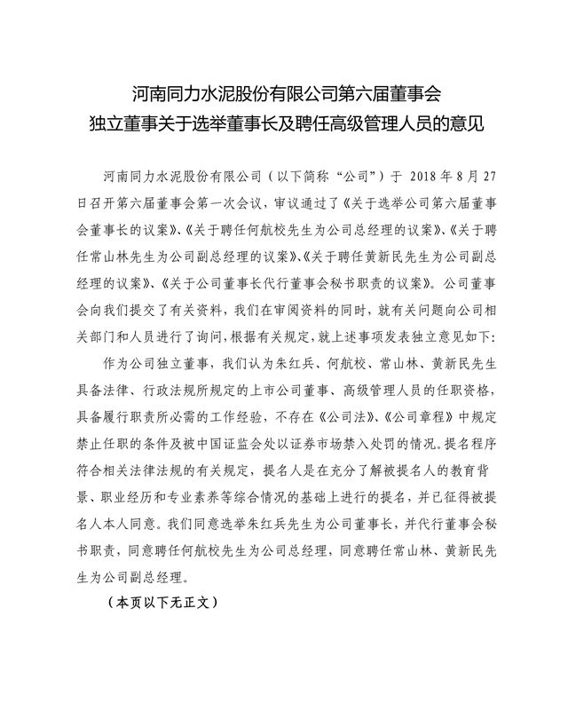 會(huì)議同時(shí)選舉朱紅兵、李明、崔星太、張東紅、陳蘭為同力水泥第六屆董事會(huì)董事;李偉真、徐步林、曹勝新為同力水泥第六屆董事會(huì)獨(dú)立董事。
