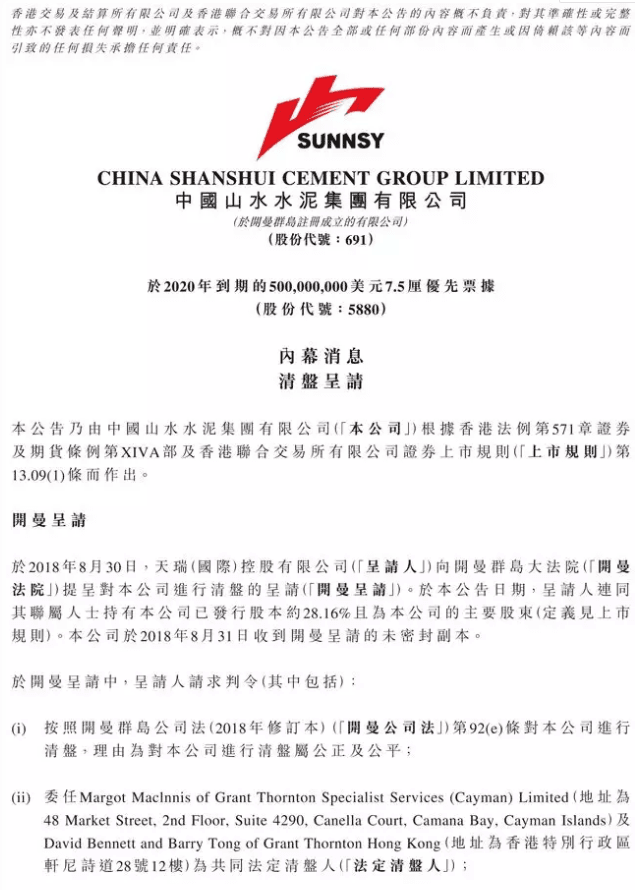 于2018年8月31日,公司收到呈請(qǐng)人于同日向香港特別行政區(qū)高等法院原訟法庭提交的對(duì)公司進(jìn)行清盤的呈請(qǐng)(香港呈請(qǐng))。遞交香港呈請(qǐng)旨在于香港開始進(jìn)行輔助清盤。