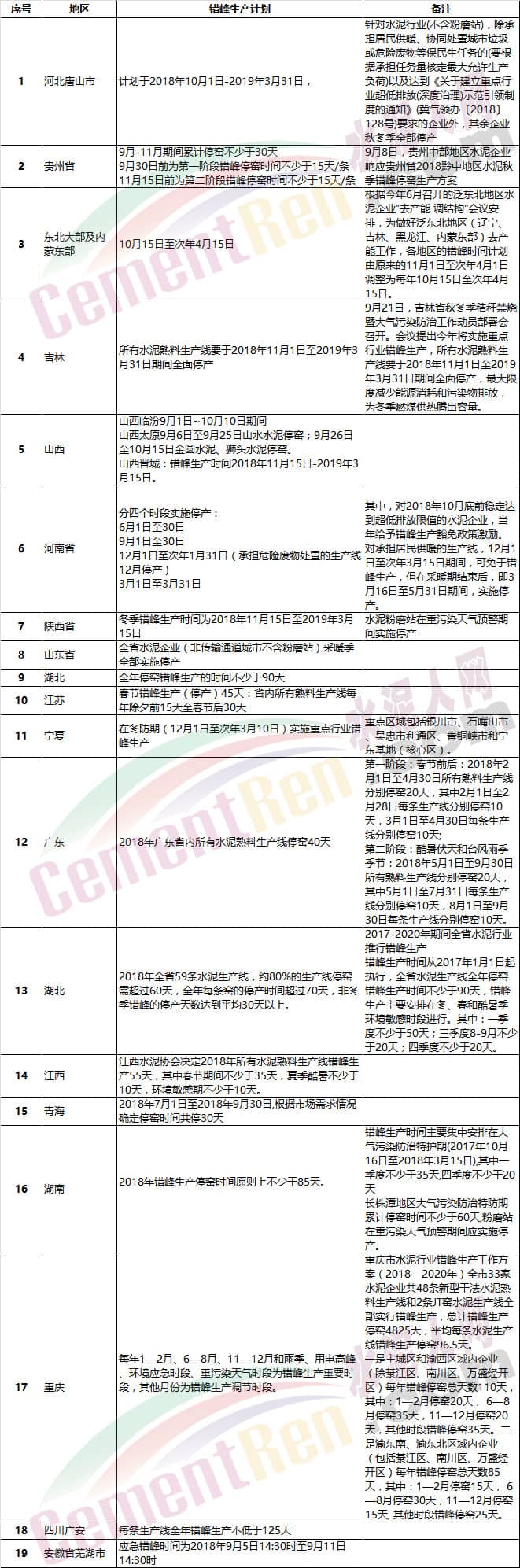 北京、天津、河北、山西、內(nèi)蒙古、遼寧、吉林、黑龍江、山東、河南、陜西、甘肅、青海、寧夏、新疆等15個省(自治區(qū)、直轄市)所有水泥生產(chǎn)線,包括利用電石渣生產(chǎn)水泥的生產(chǎn)線都應(yīng)進(jìn)行錯峰生產(chǎn)。