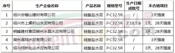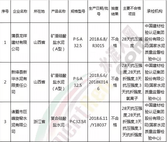 不合格產(chǎn)品及其企業(yè)名單中有三家企業(yè)顯示強度不合格,其中山西省蒲縣龍祥建材有限公司P.S.A32.5水泥28天抗壓強度不合格。山西省新絳縣新華水泥有限責任公司P.S.A32.5水泥及浙江省諸暨市巨峰旋窯水泥有限公司P.C32.5R水泥28天抗壓強度,3天抗壓強度均不合格。