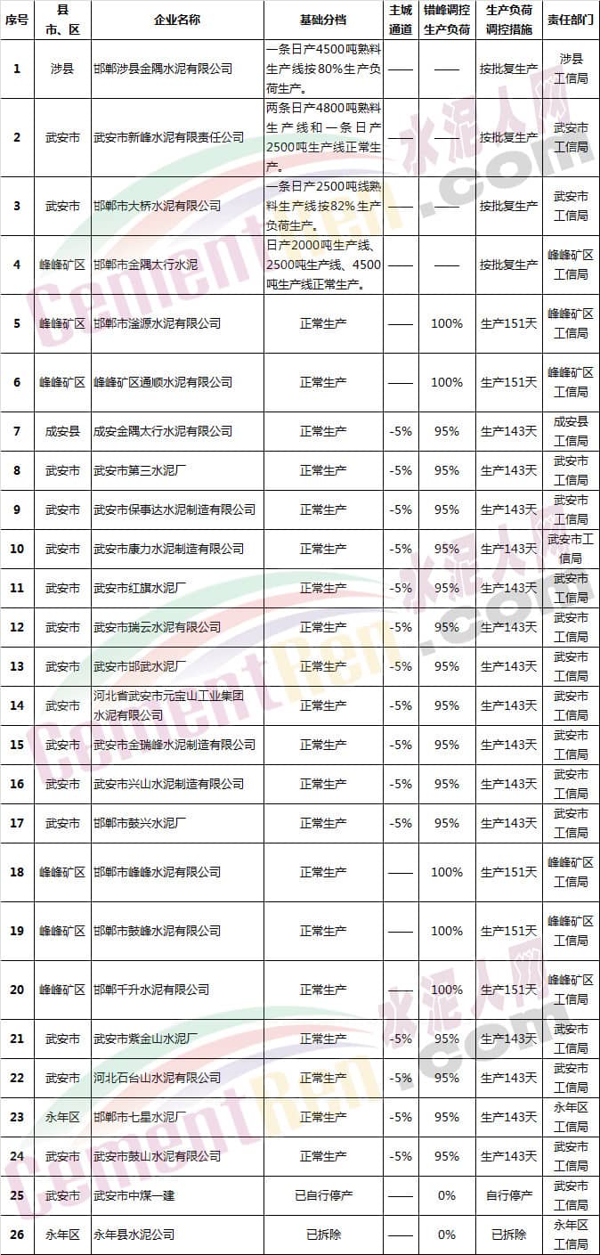 河北省邯鄲市《2018-2019年重點(diǎn)行業(yè)采暖季差異化錯(cuò)峰生產(chǎn)方案》征求意見(jiàn)稿公示版發(fā)布,其中針對(duì)水泥行業(yè)錯(cuò)峰生產(chǎn)政策措施有重大調(diào)整。