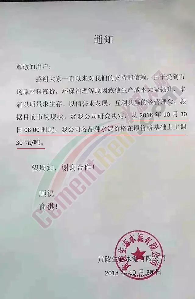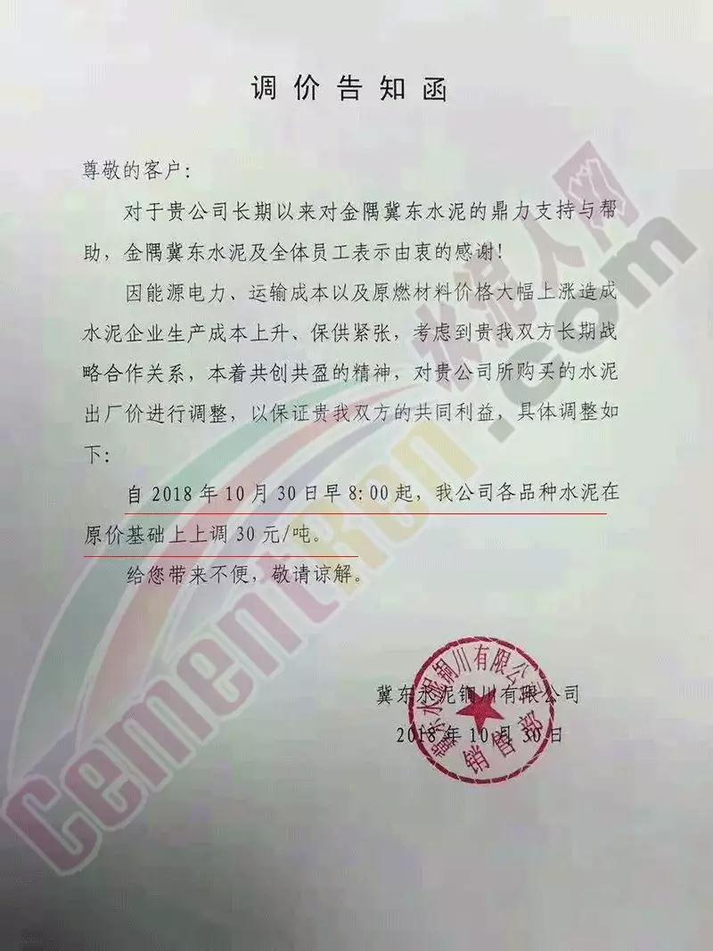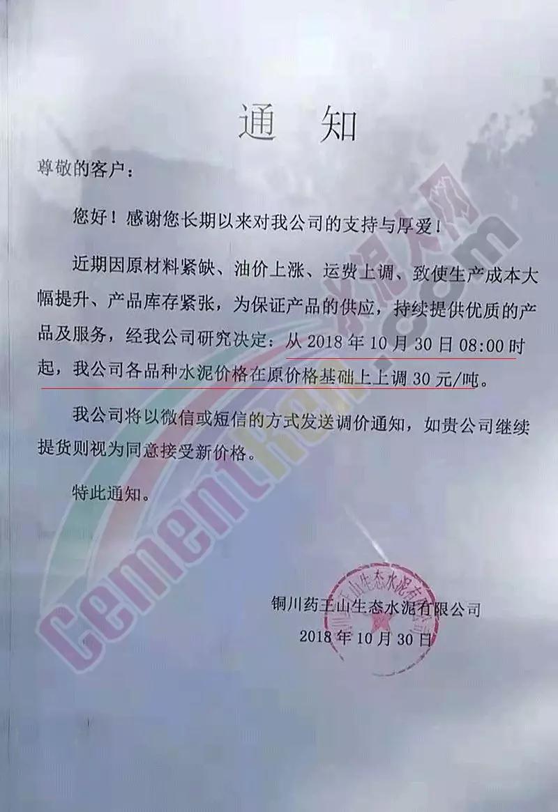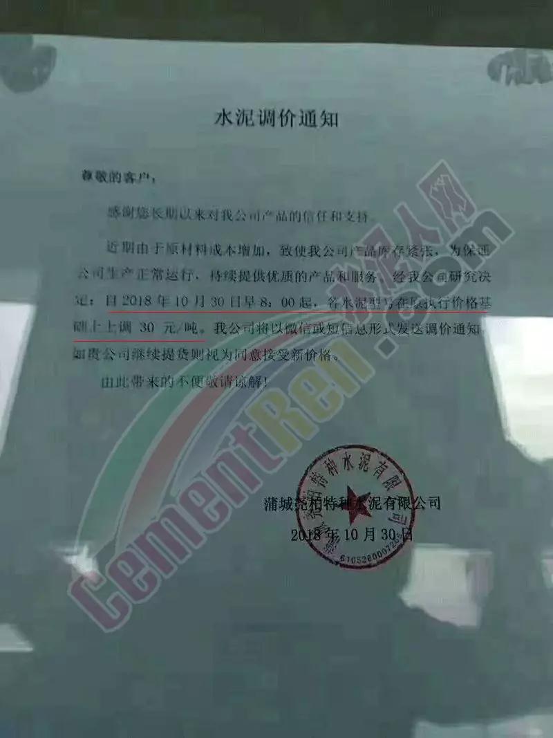 根據(jù)當前錯峰生產(chǎn)、市場行情及原材料價格上漲情況,經(jīng)公司研究決定,自2018年10月30日8時起,對PC32.5袋裝及散裝價格上調(diào)50元/噸。