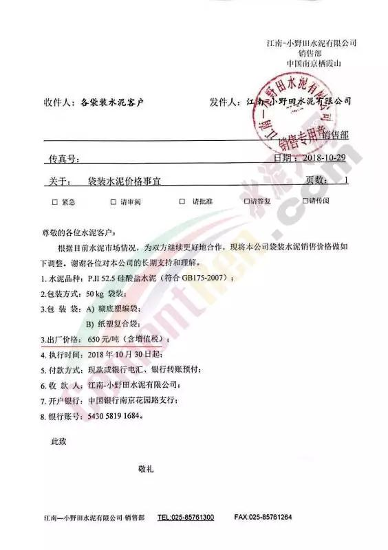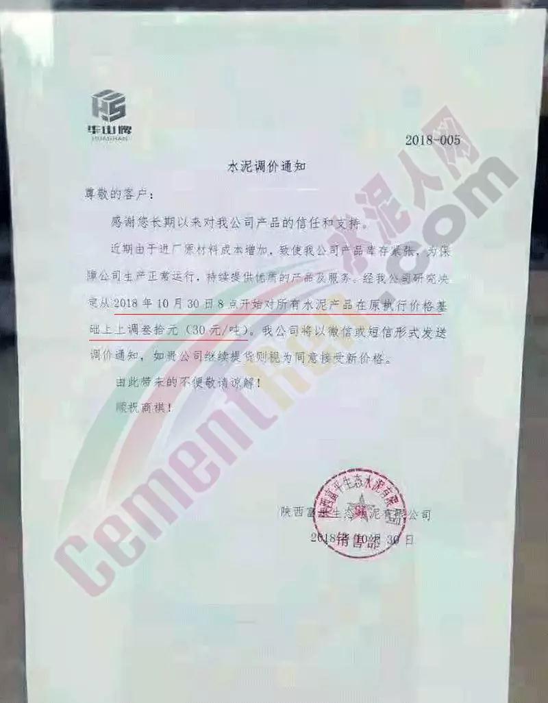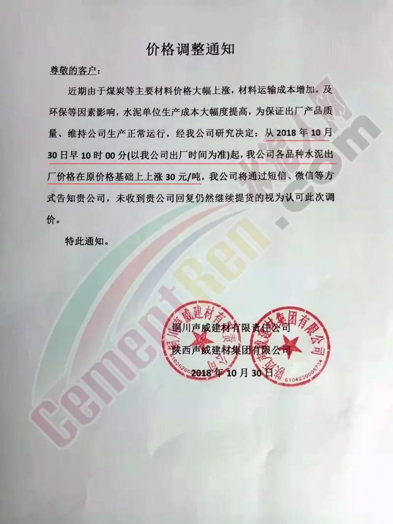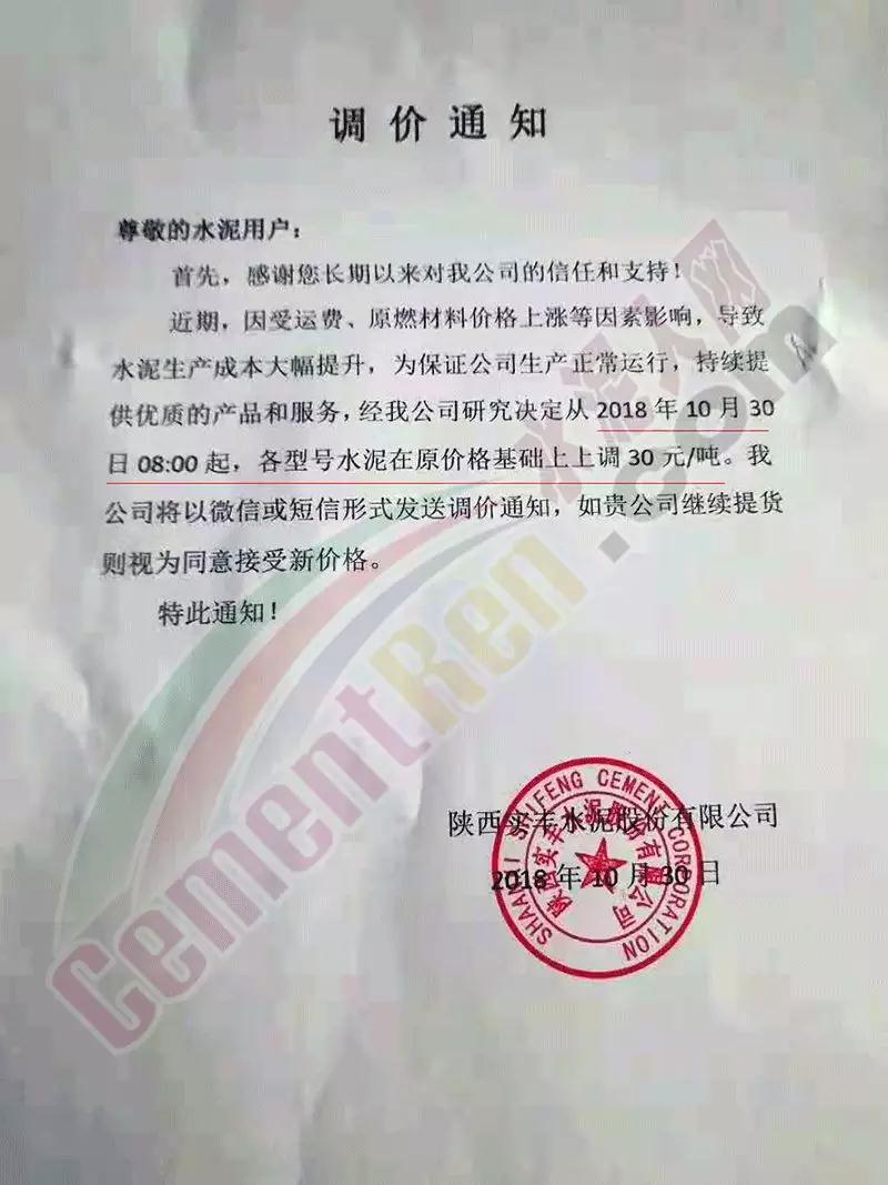 根據(jù)當前錯峰生產(chǎn)、市場行情及原材料價格上漲情況,經(jīng)公司研究決定,自2018年10月30日8時起,對PC32.5袋裝及散裝價格上調(diào)50元/噸。