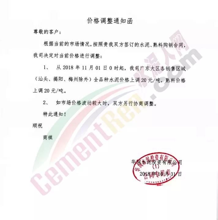 由于原材料價(jià)格上漲,公司經(jīng)營(yíng)成本上升,結(jié)合當(dāng)前市場(chǎng)行情變化,經(jīng)公司研究決定于2018年11月1日0:00時(shí)開(kāi)始對(duì)隆回區(qū)域各品種水泥、熟料價(jià)格上調(diào)30元/噸。溫馨提示:價(jià)格調(diào)整后,如您繼續(xù)安排車(chē)輛到我公司提貨,則視為確認(rèn)本次價(jià)格調(diào)整,感謝您的支持,特此通知! 【邵陽(yáng)海螺銷(xiāo)售處】