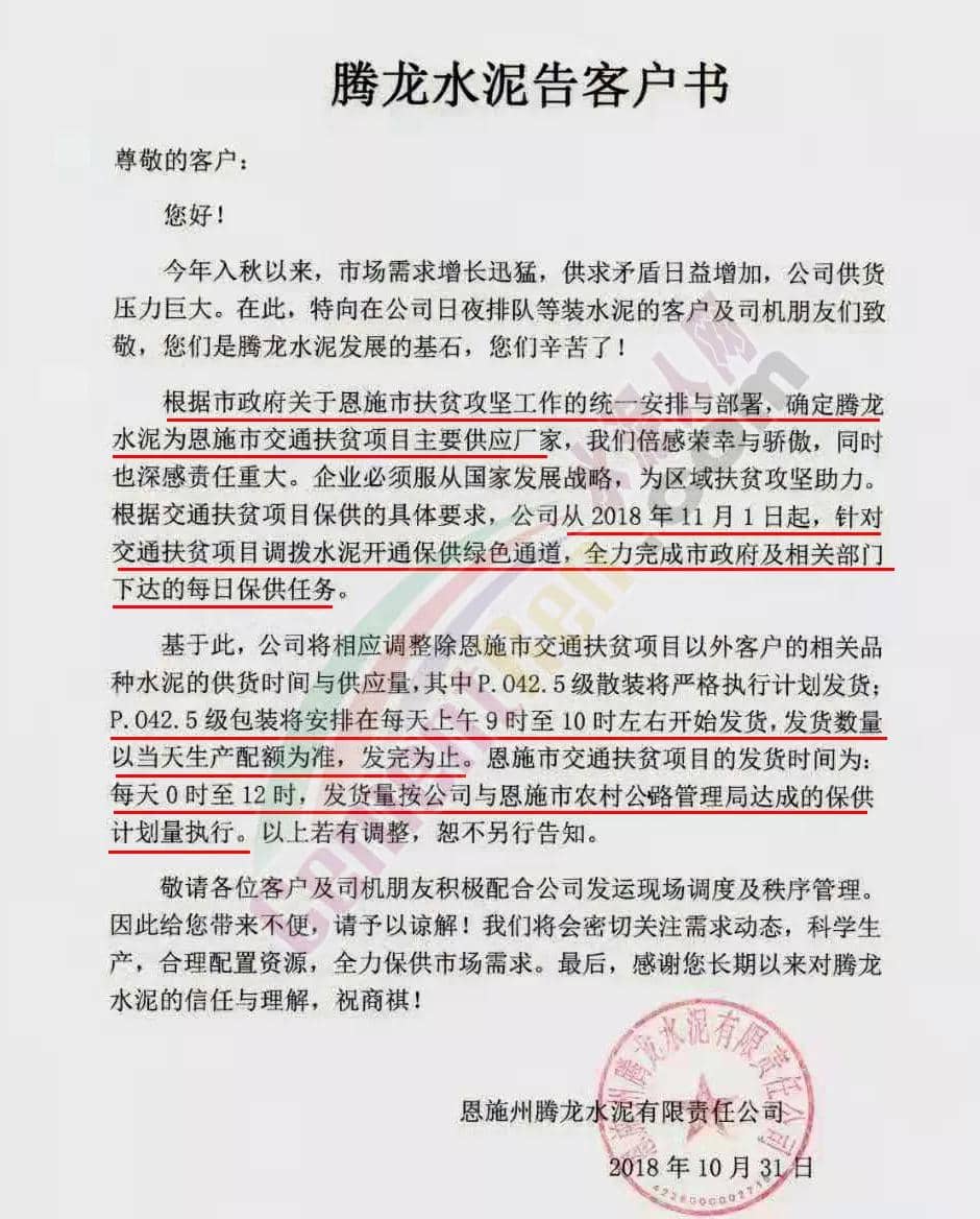 同一天,湖北恩施騰龍水泥告知下游客戶(hù),今年入秋以來(lái)市場(chǎng)需求增長(zhǎng)迅猛,供求矛盾日益增加,公司供貨壓力巨大。同時(shí),根據(jù)市政府關(guān)于恩施市扶貧攻堅(jiān)工作的統(tǒng)一安排與部署,確定騰龍水泥為恩施市交通扶貧項(xiàng)目主要供應(yīng)廠(chǎng)家,為保證交通扶貧項(xiàng)目從2018年11月1日起,針對(duì)交通扶貧項(xiàng)目調(diào)拔水泥開(kāi)通保供綠色通道,全力完成市政府及相關(guān)部門(mén)下達(dá)的每日保供任務(wù)。