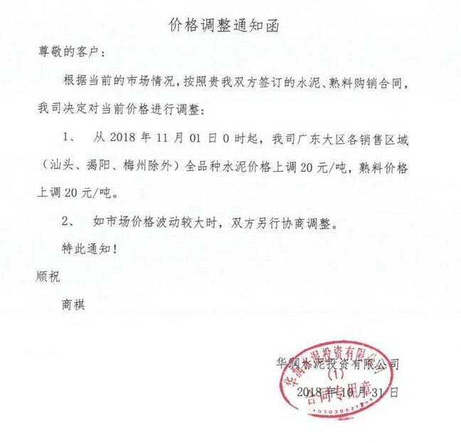 昨日廣東地區(qū)水泥廠商發(fā)布價(jià)格調(diào)整通知函:宣布廣東各大區(qū)全品種水泥價(jià)格上調(diào)20元/噸!