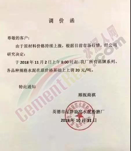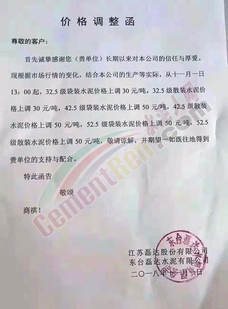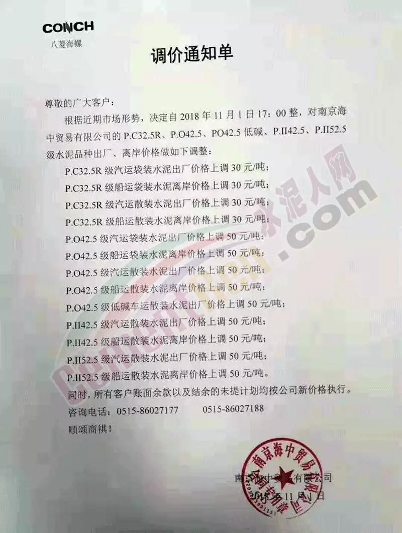 昨日(11月1日)南京海中貿(mào)易公司發(fā)布提價通知,各標號水泥價格上調(diào)30-50元/噸。