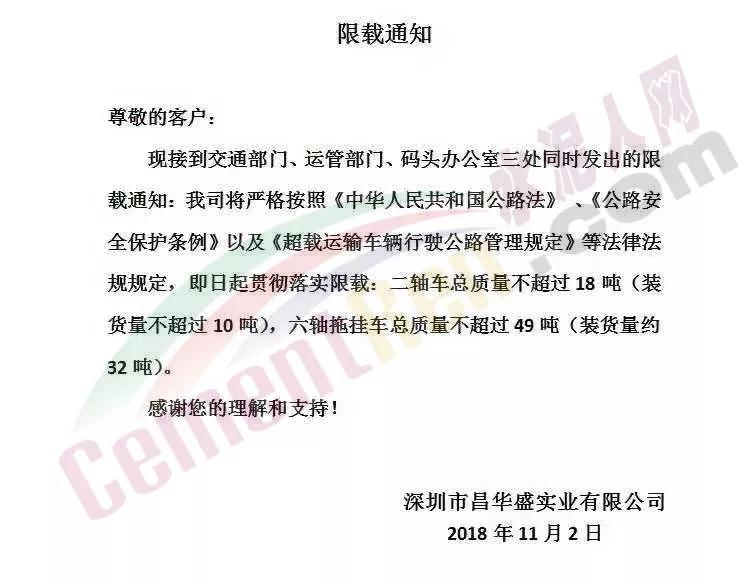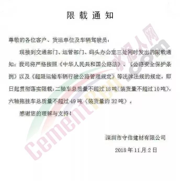 接到通知后,深圳市各區(qū)域建材相關(guān)企業(yè)紛紛下發(fā)通知,稱嚴(yán)格執(zhí)行相關(guān)文件要求。深圳市守信建材有限公司、深圳市昌華盛實(shí)業(yè)有限公司等企業(yè)發(fā)布限載通知稱,接到交通部門、運(yùn)管部門、碼頭辦公室三處同時發(fā)出的限載通知。公司將嚴(yán)格按照《中華人民共和國公路法》、《公路安全保護(hù)條例》以及《超限運(yùn)輸車輛行駛公路管理規(guī)定》等法律法規(guī)的規(guī)定,即日起貫徹落實(shí)限載:二軸車總質(zhì)量不超過18噸(裝貨量不超過10噸),六軸拖掛車總質(zhì)量不超過49噸(裝貨量約32噸)。原文如下: