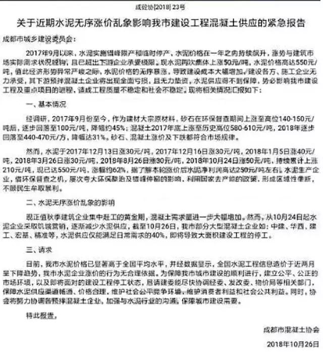 成都市混凝土協(xié)會給成都市城鄉(xiāng)建設(shè)委員會提交了《關(guān)于近期水泥無序漲價(jià)亂象影響我市建設(shè)工程混凝土供應(yīng)的緊急報(bào)告》(成砼協(xié)「2018」23號)稱:水泥實(shí)施錯(cuò)峰限產(chǎn)和臨時(shí)停產(chǎn),水泥價(jià)格在一年之內(nèi)持續(xù)飆升,漲勢與建筑市場實(shí)際需求狀況脫鉤,且已超出下游企業(yè)承受極限。