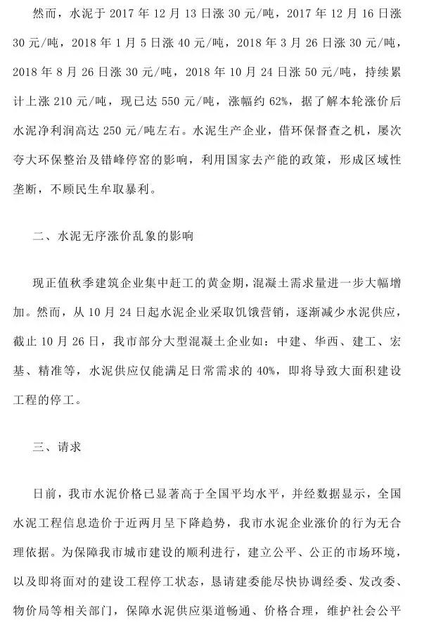 除此之外,成都市混凝土協(xié)會發(fā)布《關(guān)于近期水泥無序漲價亂象影響我市建設(shè)工程混凝土供應(yīng)的緊急報告》,該文件指出成都市水泥價格持續(xù)上漲,已經(jīng)嚴(yán)重影響到了民生,懇請建委能盡快協(xié)調(diào)經(jīng)委、發(fā)改委、物價局等相關(guān)部門,保障水泥供應(yīng)渠道暢通、價格合理,維護社會公平競爭環(huán)境,維護消費者利益和社會公開利益。
