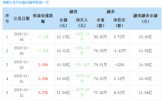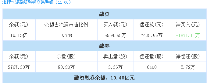 海螺水泥融資融券信息顯示,2018年11月6日融資凈償還1871.11萬(wàn)元,融資余額10.13億元,較前一交易日下降1.81%。