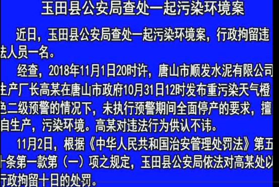 經(jīng)查,2018年11月1日20時(shí)許,玉田縣林西鎮(zhèn)唐山市順發(fā)水泥有限公司生產(chǎn)廠(chǎng)長(zhǎng)高某在唐山市政府10月31日12時(shí)發(fā)布重污染天氣橙色二級(jí)預(yù)警的情況下,未執(zhí)行預(yù)警期間全面停產(chǎn)的要求,擅自生產(chǎn),污染環(huán)境。高某對(duì)違法行為供認(rèn)不諱。