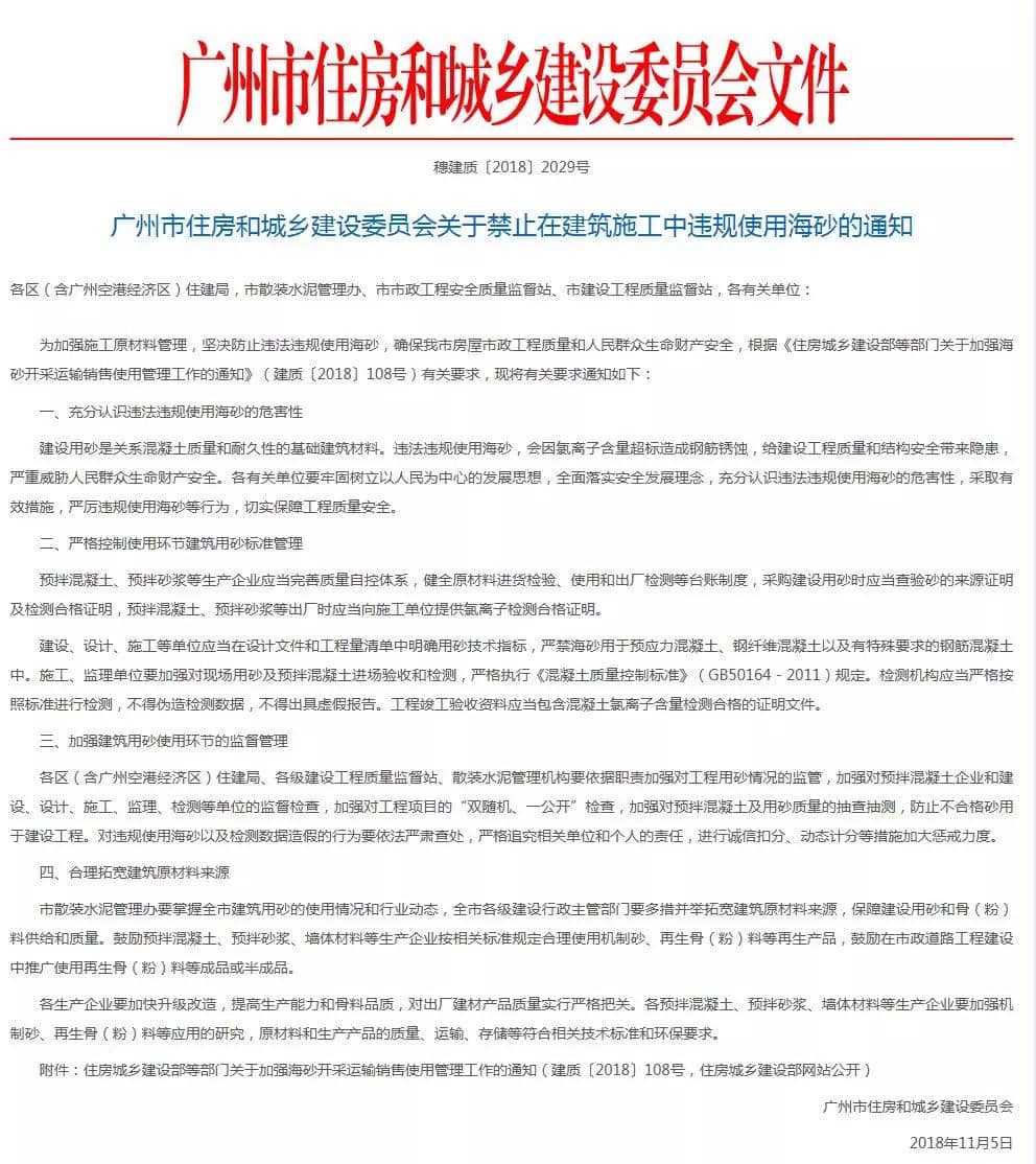 此外,《通知》還要求合理拓寬建筑原材料來源。廣州全市各級建設(shè)行政主管部門要多措并舉拓寬建筑原材料來源,保障建設(shè)用砂和骨(粉)料供給和質(zhì)量。鼓勵預(yù)拌混凝土、預(yù)拌砂漿、墻體材料等生產(chǎn)企業(yè)按相關(guān)標(biāo)準(zhǔn)規(guī)定合理使用機(jī)制砂、再生骨(粉)料等再生產(chǎn)品,鼓勵在市政道路工程建設(shè)中推廣使用再生骨(粉)料等成品或半成品。通知原文如下: