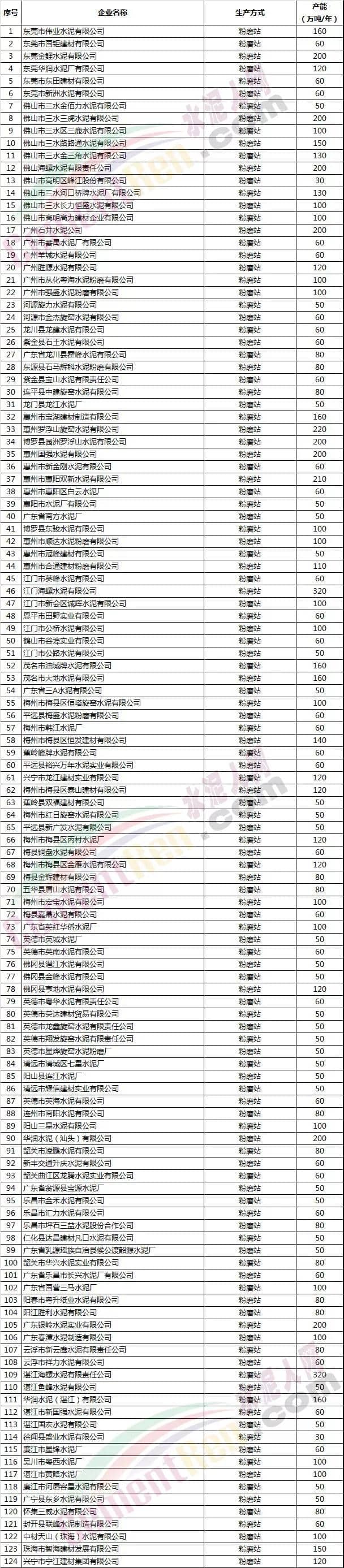 廣東省部分水泥企業(yè)名單