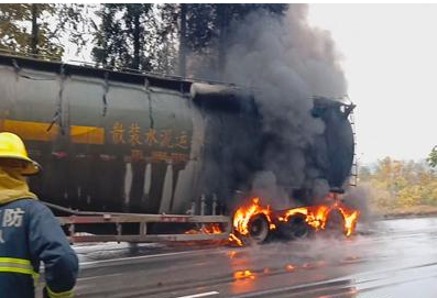 途中消防員迅速與報(bào)警人取得聯(lián)系,了解現(xiàn)場(chǎng)具體情況。經(jīng)了解,是從山東開(kāi)往睢寧方向一輛運(yùn)輸水泥的罐車(chē)著火。中隊(duì)抵達(dá)現(xiàn)場(chǎng),迅速鋪設(shè)水帶出水滅火,經(jīng)過(guò)15分鐘左右的撲救明火被撲滅。據(jù)車(chē)主了解,是由于車(chē)子在行駛過(guò)程中爆胎引發(fā)起火的,主要燃燒部位為后輪胎。事故所幸沒(méi)有造成人員被困和受傷。