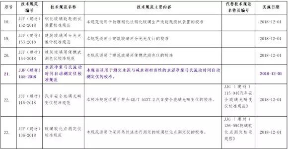 水泥行業(yè),編號JJF(建材)145-2018的混凝土配料秤校準規(guī)范、編號JJF(建材)148-2018的水泥中氯離子含量測定用蒸餾儀校準規(guī)范、編號JJF(建材)149-2018的水泥中游離氧化鈣絡合反應裝置校準規(guī)范、編號JJF(建材)155-2018的水泥凈漿馬氏流動時間自動測定儀校準規(guī)范四項校準規(guī)范被列入名單中,規(guī)范均從2018年12月1日起正式實施。