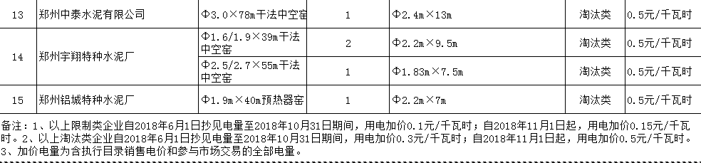 三、鄭州中泰水泥有限公司等9家企業(yè)的部分生產(chǎn)設(shè)施屬淘汰類項(xiàng)目(見附表),自2018年6月1日抄見電量至2018年10月31日期間,用電加價(jià)0.3元/千瓦時(shí);自2018年11月1日起,用電加價(jià)0.5元/千瓦時(shí)。