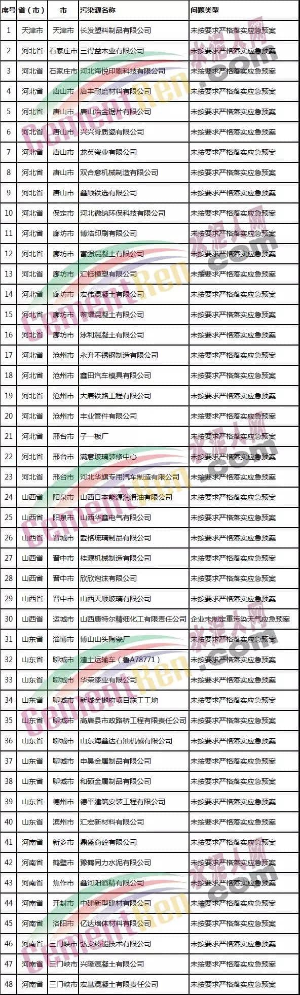 11月15日,2018-2019年藍(lán)天保衛(wèi)戰(zhàn)重點(diǎn)區(qū)域強(qiáng)化監(jiān)督工作組共檢查啟動(dòng)重污染天氣應(yīng)急響應(yīng)城市1785家企業(yè)(點(diǎn)位),發(fā)現(xiàn)有48家企業(yè)(點(diǎn)位)未嚴(yán)格執(zhí)行重污染天氣應(yīng)急響應(yīng)要求(見附件)。