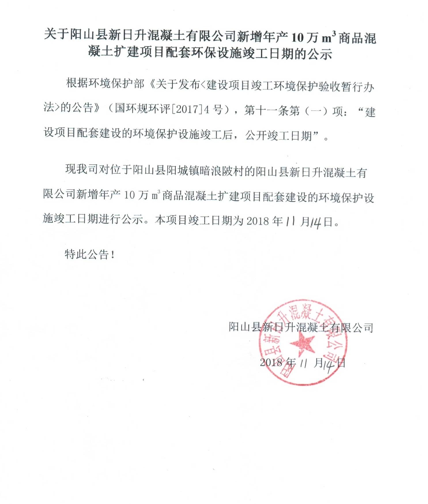 陽山縣新增年產(chǎn)10萬m3商品混凝土擴(kuò)建項(xiàng)目配套環(huán)保設(shè)施竣工日期的公示