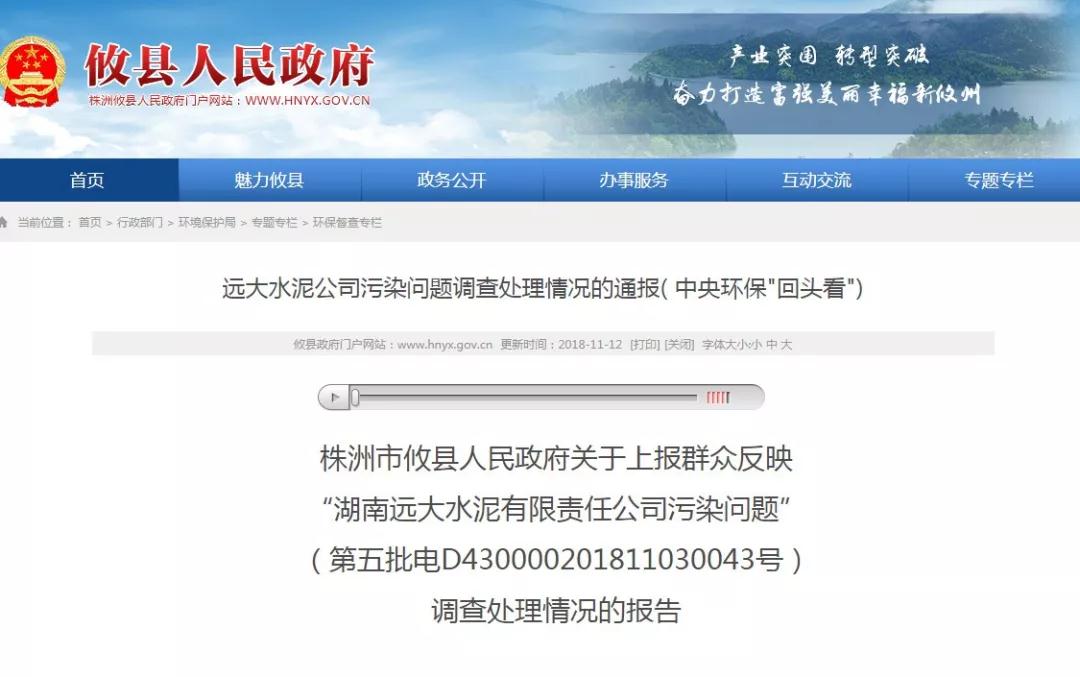湖南省株洲市攸縣人民政府消息,關(guān)于上報(bào)群眾反映“湖南遠(yuǎn)大水泥有限責(zé)任公司污染問題”(第五批電D430000201811030043號(hào)),相關(guān)調(diào)查處理情況如下: