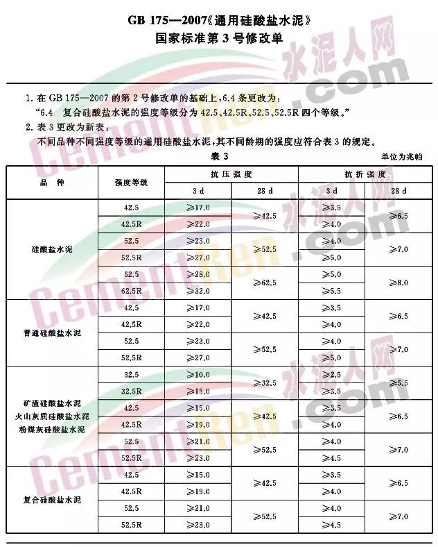 據(jù)水泥人網(wǎng)消息,昨日(11月19日)國家市場監(jiān)督管理總局標(biāo)準(zhǔn)委發(fā)布了2018年第15號公告,國家市場監(jiān)督管理總局、國家標(biāo)準(zhǔn)化管理委員會批準(zhǔn)了《汽車用制動器襯片》等27項國家標(biāo)準(zhǔn)和2項國家標(biāo)準(zhǔn)修改單,其中包括GB 175-2007《通用硅酸鹽水泥<第3號修改單>》,主要內(nèi)容為“全面取消32.5復(fù)合硅酸鹽水泥”,該標(biāo)準(zhǔn)于2019年10月1日起正式實施。