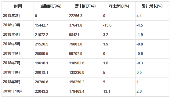 2018年10月全國(guó)水泥產(chǎn)量為22043.2萬(wàn)噸,累計(jì)值為179463.4萬(wàn)噸,同比增長(zhǎng)13.1%,累計(jì)增長(zhǎng)2.6%。
