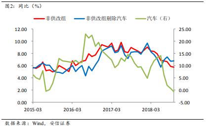 作為與真實(shí)經(jīng)濟(jì)更為相關(guān)的非供改組的走勢(shì)值得進(jìn)一步深入探討。汽車(chē)行業(yè)占比較大,而且今年以來(lái)波動(dòng)較大,可能對(duì)整體數(shù)據(jù)有干擾。如果我們把非供改組剔除汽車(chē)以后,實(shí)際上非供改組的生產(chǎn)走勢(shì)自7月份以來(lái)保持平穩(wěn)。