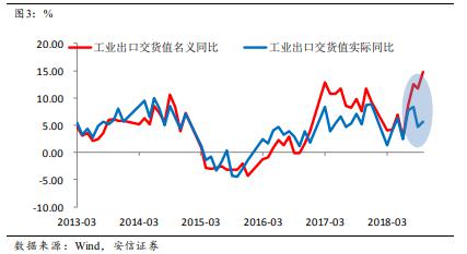 這與市場(chǎng)的感官認(rèn)知有一定的差異,也與之前一路下降的走勢(shì)不一致。我們認(rèn)為,7-10月出口出現(xiàn)了明顯的反彈,支撐了7-10月的工業(yè)生產(chǎn)。由于人民幣貶值,出口名義值反彈明顯;但即使從實(shí)際值看,7-10月的工業(yè)出口實(shí)際增速為6.6%,比3-6月的3.5%多增了3%;如果按照出口占工業(yè)生產(chǎn)的30%粗略估計(jì),這四個(gè)月出口的回升拉升了工業(yè)增加值增速將近一個(gè)百分點(diǎn)。