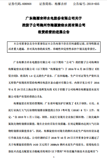 廣東省梅雁吉祥水電股份有限公司關(guān)于控股子公司梅州市眉雁旋窯水泥有限公司租賃經(jīng)營(yíng)的進(jìn)展公告文件如下: