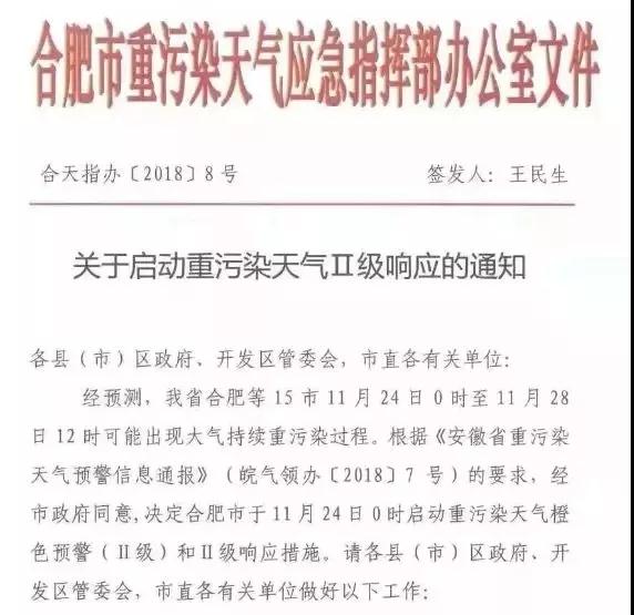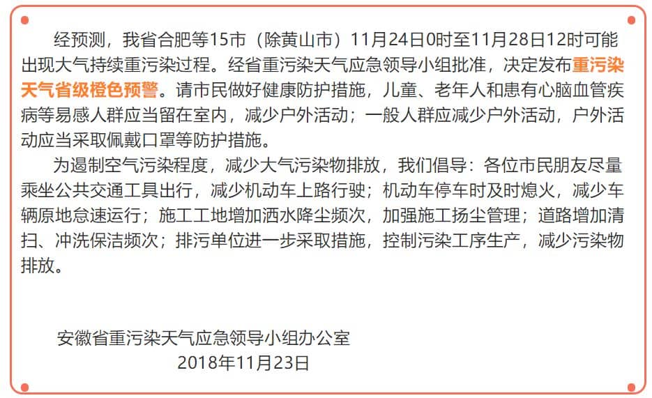 經(jīng)預(yù)測(cè),安徽省合肥等15市(除黃山市)11月24日0時(shí)至11月28日12時(shí)可能出現(xiàn)大氣持續(xù)重污染過(guò)程。