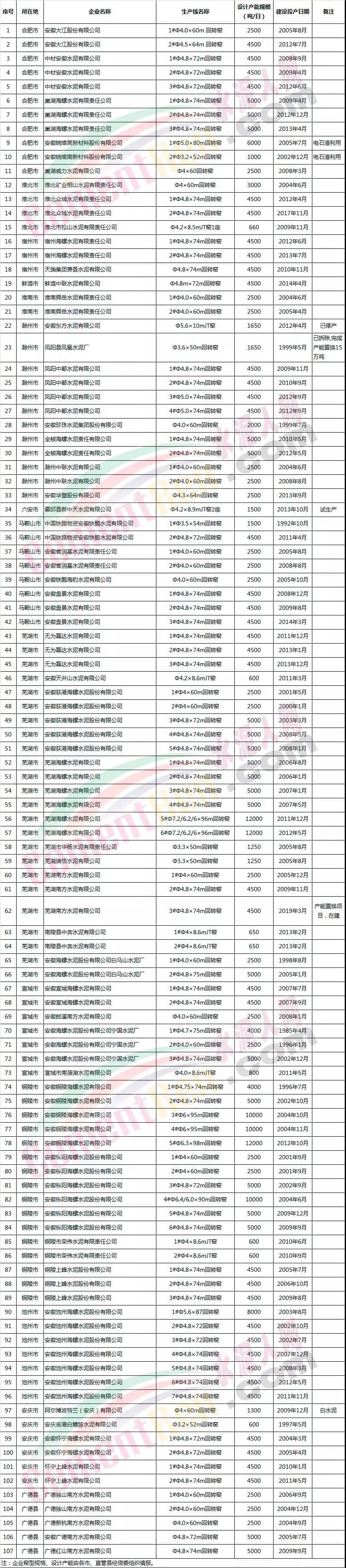 安徽省部分水泥企業(yè)名單