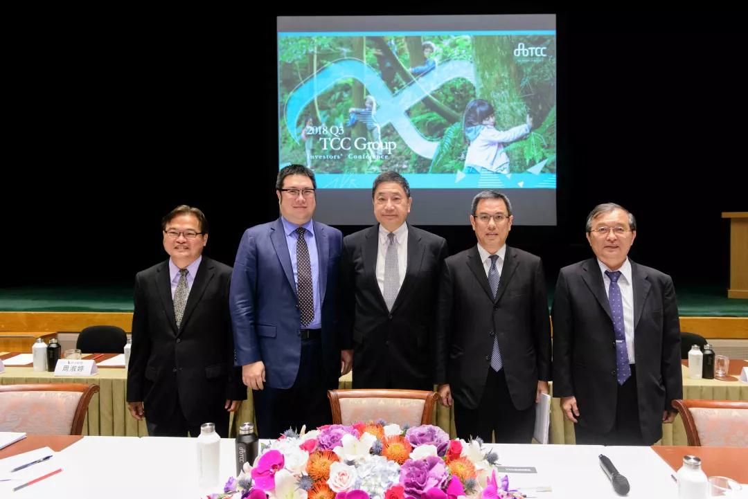 臺(tái)泥董事長(zhǎng)張安平(中)與集團(tuán)企業(yè)中橡、信昌化董事長(zhǎng)辜公怡(左二)、臺(tái)泥總經(jīng)理李鐘培(右二)、信昌化總經(jīng)理趙天福(右一)及中橡總經(jīng)理黃柏松(左一)一起參加法說(shuō)會(huì)