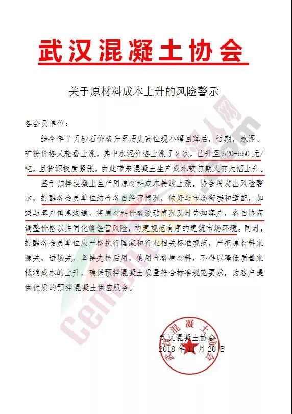 此前,武漢混凝土協(xié)會也曾發(fā)布預警通知稱,繼今年7月砂石價格升至歷史高位現小幅回落后。近期,水泥、礦粉價格又輪番上漲,其中水泥價格上漲2次,已升至520-550元/噸,且貨源極度緊張,由此帶來混凝土生產成本較前期又有大幅上升,鑒于預拌混凝土生產用原材料成本持續(xù)上漲,協(xié)會特發(fā)出風險警示。