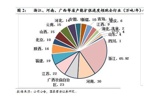 先天條件決定了水泥窯協(xié)同處置工藝的產(chǎn)能釋放速度快 審批周期短:由于危廢協(xié)同處置的設(shè)施直接建設(shè)在水泥廠內(nèi),而水泥廠本身衛(wèi)生防護距離800米,群眾阻力較小,不存在選址難度。水泥窯協(xié)同處置危廢項目,從項目備案到最終投運,周期在2-3年之間,較之傳統(tǒng)焚燒節(jié)約3年左右時間。 單體項目產(chǎn)能規(guī)模大:目前參與協(xié)同處置改造的水泥窯,水泥產(chǎn)能規(guī)模普遍為5000t/d,對應(yīng)危廢產(chǎn)能一般為10萬噸/年,單體規(guī)模相當于傳統(tǒng)專業(yè)焚燒爐的5-10倍,顯著提升了產(chǎn)能擴張速度。 工程改造+爬坡周期短:水泥窯協(xié)同處置的改造,主要包括工程改造和運行爬坡兩方面,整體改造周期約為8-9個月,建成之后項目爬坡周期較短,產(chǎn)能釋放速度快。而傳統(tǒng)危廢無害化處置項目一般需要2-3年建設(shè)期和1-2年的產(chǎn)能爬坡期。例如,金隅紅樹林的廣靈金隅項目自6月12日項目組進廠服務(wù),同年11月7日即取得危廢經(jīng)營許可證,原計劃8個月的施工建設(shè)+取證周期被縮短至5個月完成,創(chuàng)造了業(yè)界最快的施工和取證速度記錄。 1.2浙江、河南、廣西、江蘇與福建領(lǐng)跑,合計市占率達56% 截止目前我國已有20個省份(或直轄市)存在水泥窯協(xié)同處置危險廢物的產(chǎn)能,其中產(chǎn)能規(guī)模居前的省份包括:浙江(66萬噸/年)、河南(30萬噸/年)、廣西(22萬噸/年)、江蘇(22萬噸/年)與福建(19萬噸/年),規(guī)模前五名的省份,合計規(guī)模占比全國56%。而廣東、上海和湖南等工業(yè)相對較為發(fā)達的區(qū)域,尚未有水泥窯協(xié)同處置危廢項目投產(chǎn),未來空間仍較大.