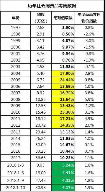 歷年社會(huì)消費(fèi)品零售數(shù)據(jù)顯示額度方面也有所下降,絕對(duì)值增幅今年較前幾年有所下降。年度商品零售物價(jià)指數(shù)較前五年有所上漲, 詳情見(jiàn)下表:
