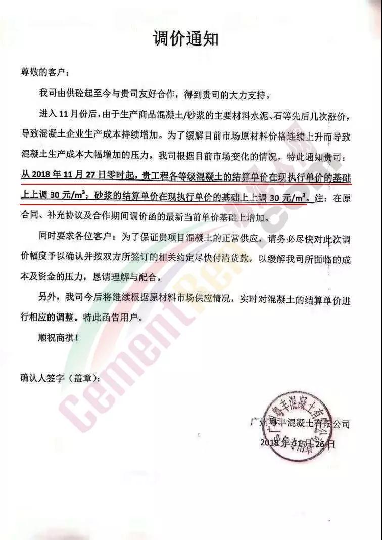 同期,廣東區(qū)域多家商混企業(yè)發(fā)通知提價(jià)。其調(diào)價(jià)通知稱,進(jìn)入11月份后,由于生產(chǎn)商品混凝土/砂漿的主要材料水泥、石等先后幾次漲價(jià),導(dǎo)致混凝土企業(yè)生產(chǎn)成本持續(xù)增加。
