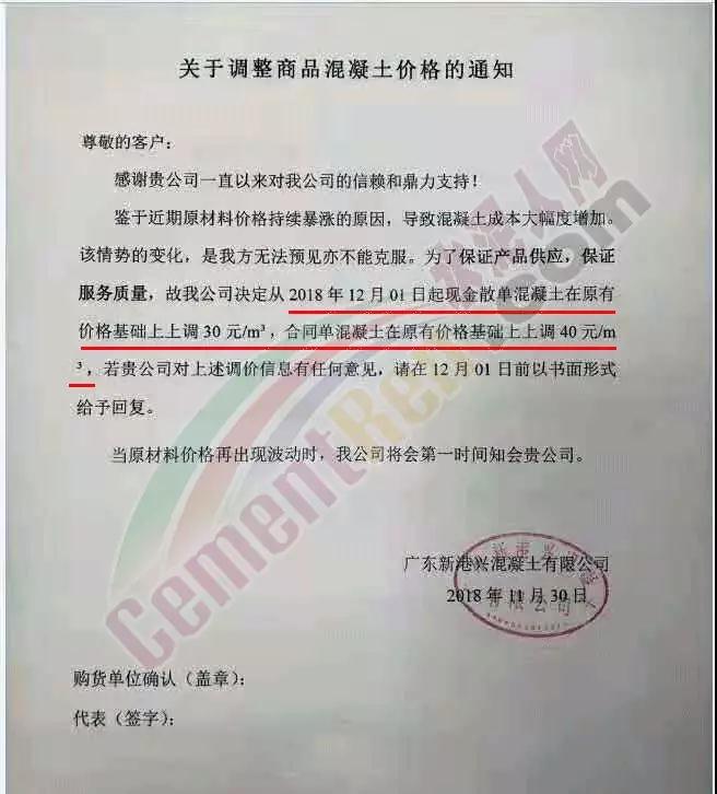 日前,廣東新港興混凝土有限公司發(fā)布了《關(guān)于調(diào)整商品混凝土價格的通知》通知稱鑒于近期原材料價格持續(xù)暴漲的原因,導(dǎo)致混凝土成本大幅增加。該情勢的變化,是企業(yè)無法預(yù)見亦不能克服的。為了保證產(chǎn)品供應(yīng),保證服務(wù)質(zhì)量。公司決定從12月1日起現(xiàn)金散單混凝土在原有價格基礎(chǔ)上上調(diào)30元/立方米,合同單混凝土在原有價格基礎(chǔ)上上調(diào)40元/立方米。