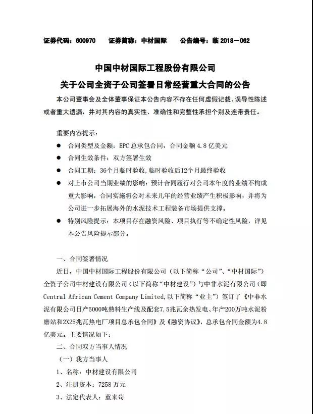 昨日(12月6日)上市公司中材國際(600970.sh)發(fā)布公告稱,旗下全資子公司中材建設(shè)有限公司(下稱“中材建設(shè)”)與中非水泥有限公司(即CentralAfricanCementCompanyLimited,下稱“業(yè)主")簽訂了《中非水泥有限公司日產(chǎn)5000噸水泥熟料生產(chǎn)線及配套7.5兆瓦余熱發(fā)電、年產(chǎn)200萬噸水泥粉磨站和2X25兆瓦熱電廠項目總承包合同》及《融資協(xié)議》,總承包合同金額為4.8億美元。